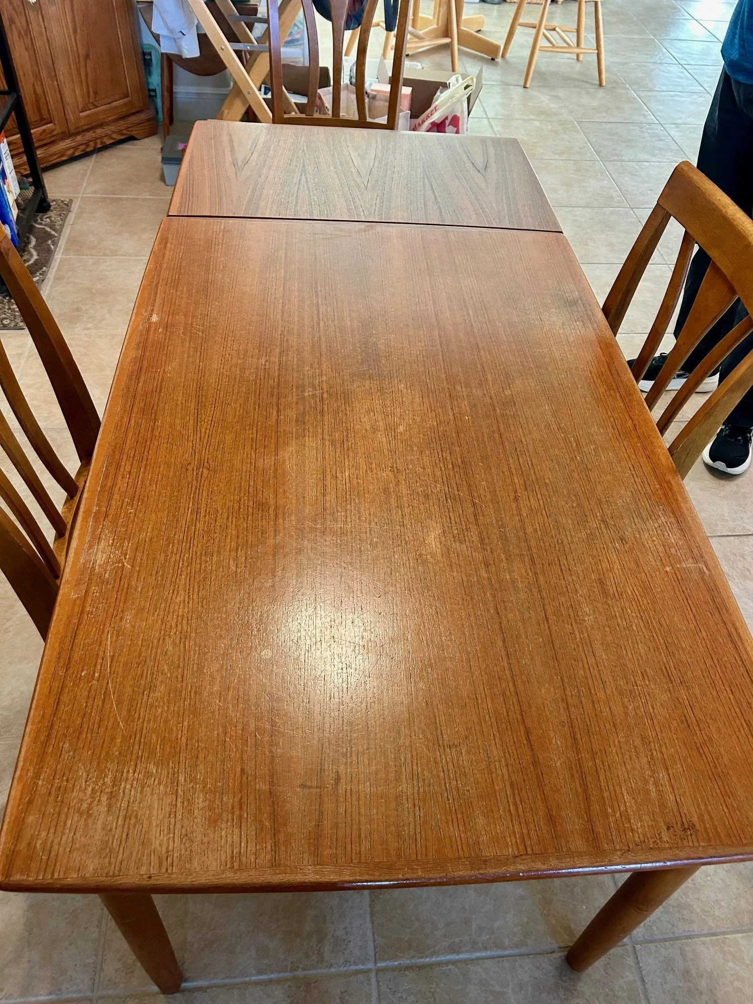 40 Year old Teak draw leaf dining table has a worn finish from decades of loving use.