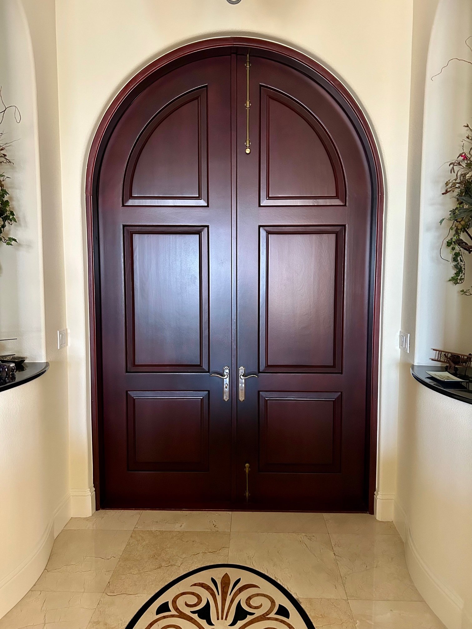 Restored Interior after repairs and refinish bring out the warmth and craftsmanship of these impressive doors.