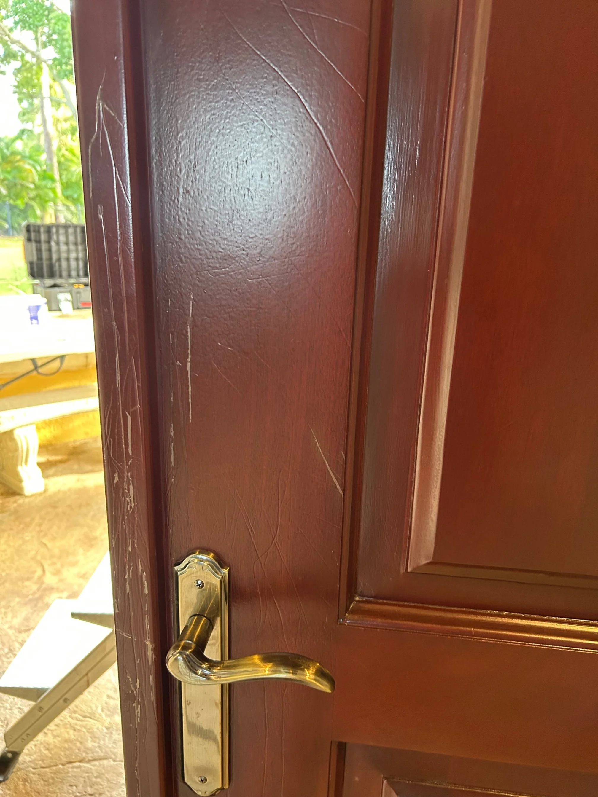 Interior Doors damaged from dog scratching. Repaired and refinished to match the previously restored exterior finish.