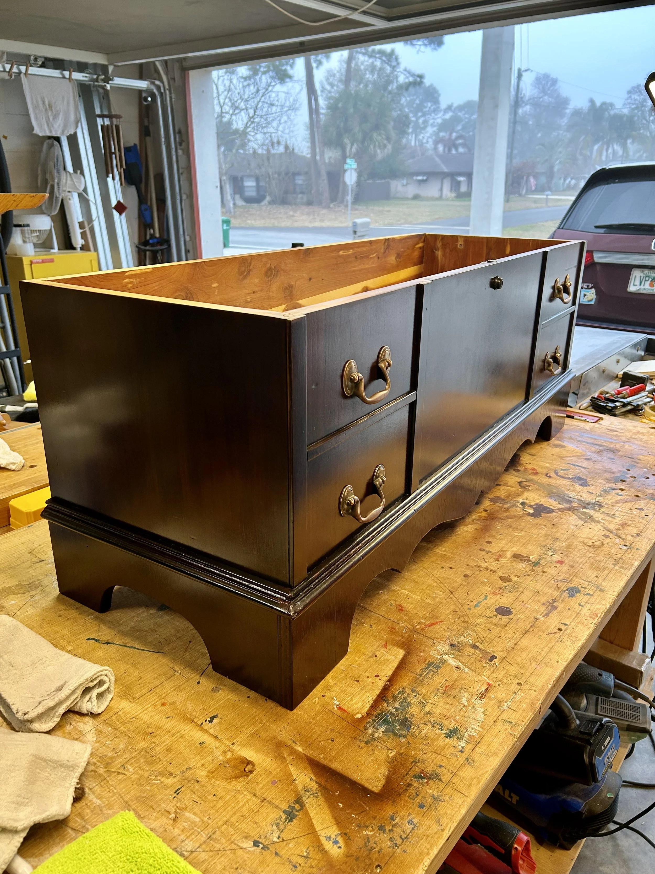 Completed restoration with color shift and fresh topcoats. Cleaned and applied hard wax oil to the interior to nourish the aromatic cedar