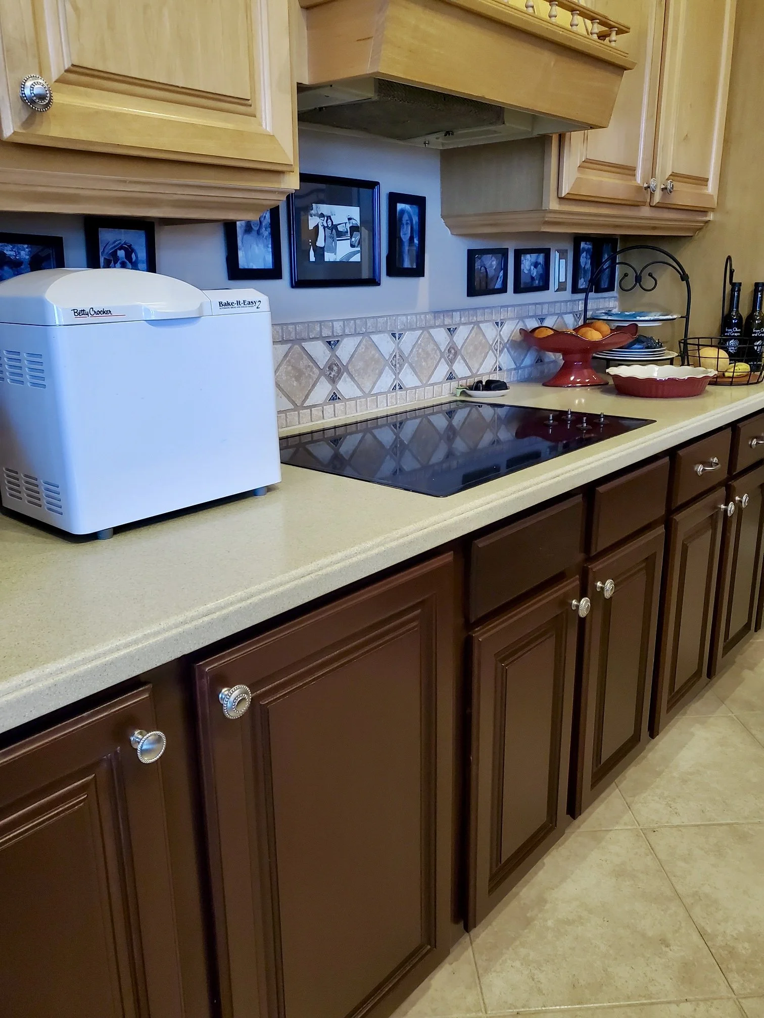 Maple cabinetry was stained to create two-toned design between upper and lower cabinets
