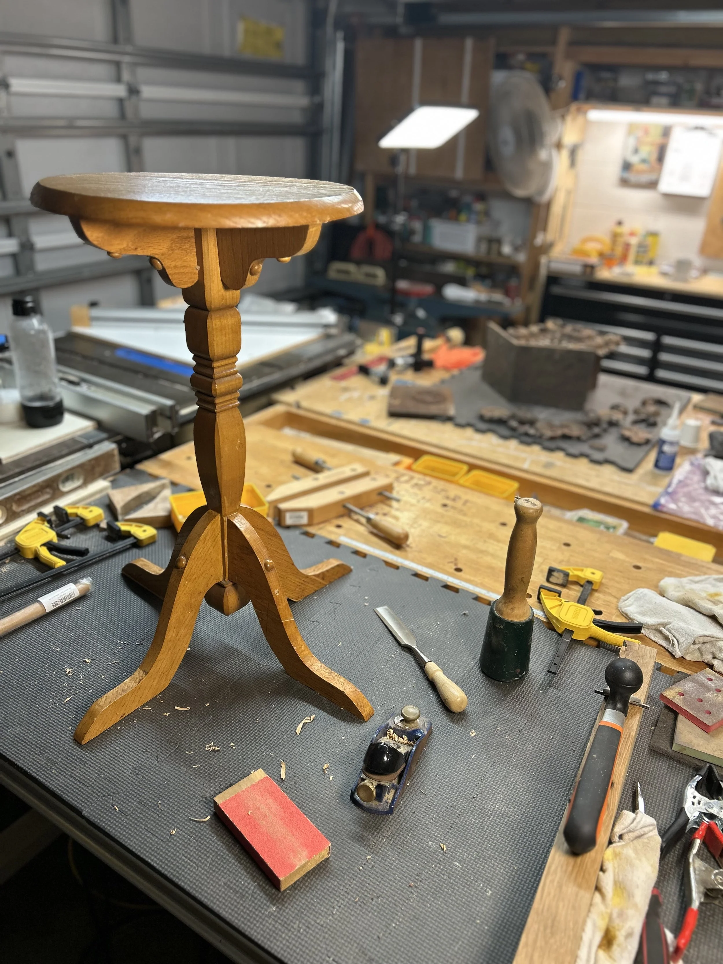 Disassembled for sanding and new glue added to the joints for stability.