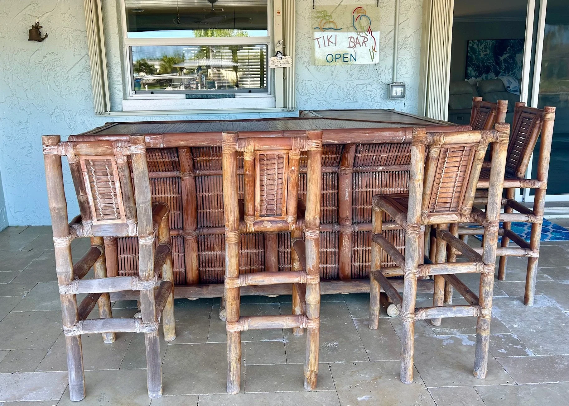 Weathered finish from 20 years of enjoyment. The bar was too large to move to my shop so all of the work was completed on-site.